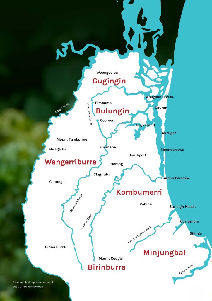 We serve the Gold Coast region in Queensland, Australia. This geographic area includes a diverse range of communities, from urban centres to more regional areas of hinterland and valleys. GCPHN’s reach encompasses the entire City of Gold Coast Local Government Area and stretches from Coolangatta in the south up to Logan and Albert Rivers in the north/northwest, and to Tamborine, Mount Tamborine, Canungra and Beechmont to the west.
